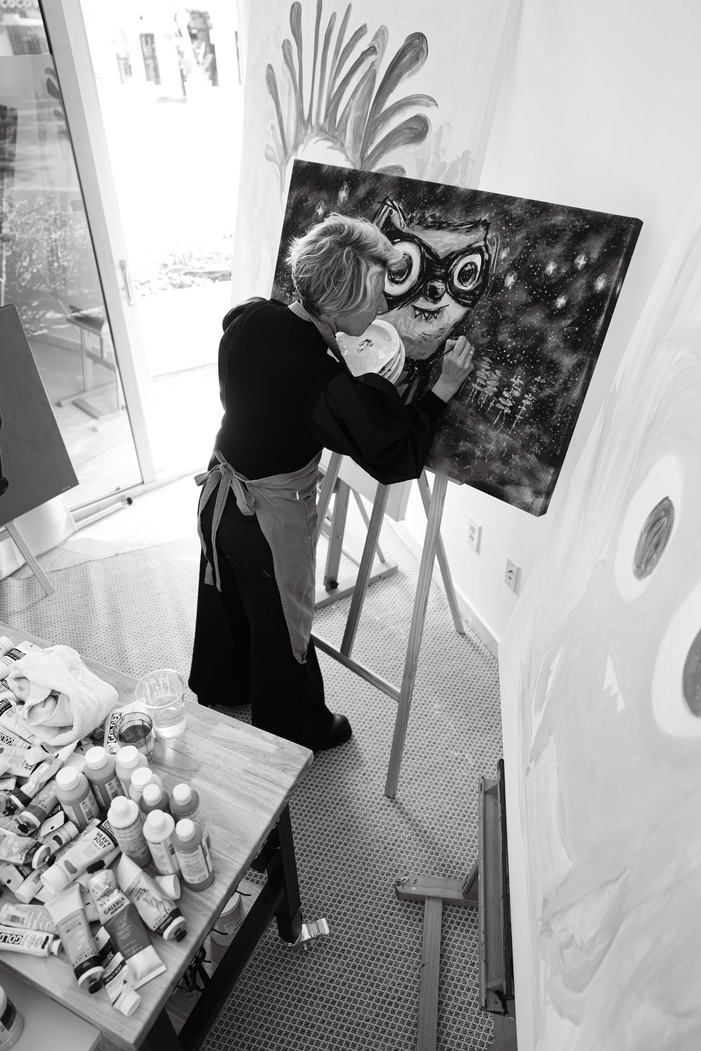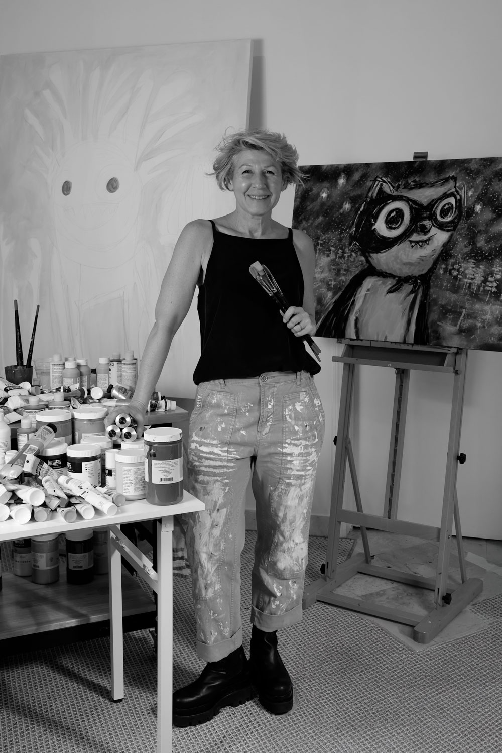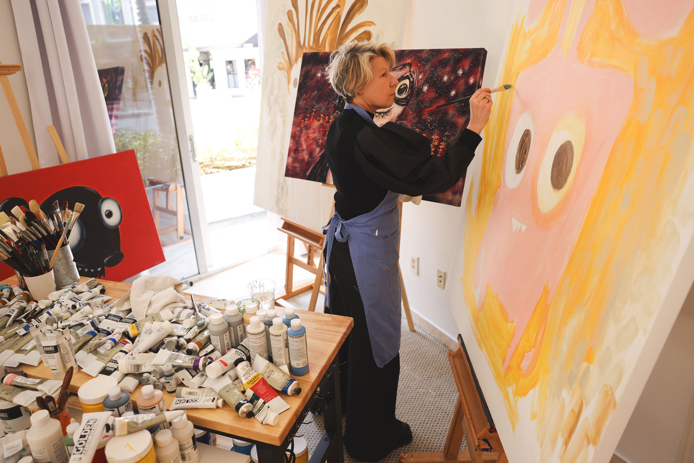 Though long known as a digital artist, Leibovich transitioned, almost in reverse, into painting following a period of serious illness that forced her to slow down and return to drawing by hand. Beginning with small, quirky figures, her practice gradually shifted toward acrylics, pencil, and paint, emphasizing tactility, natural light, and the physical act of mark-making. These cartoon-like figures function as emotional proxies rather than literal narratives, balancing levity and vulnerability while reflecting deeply personal experiences.