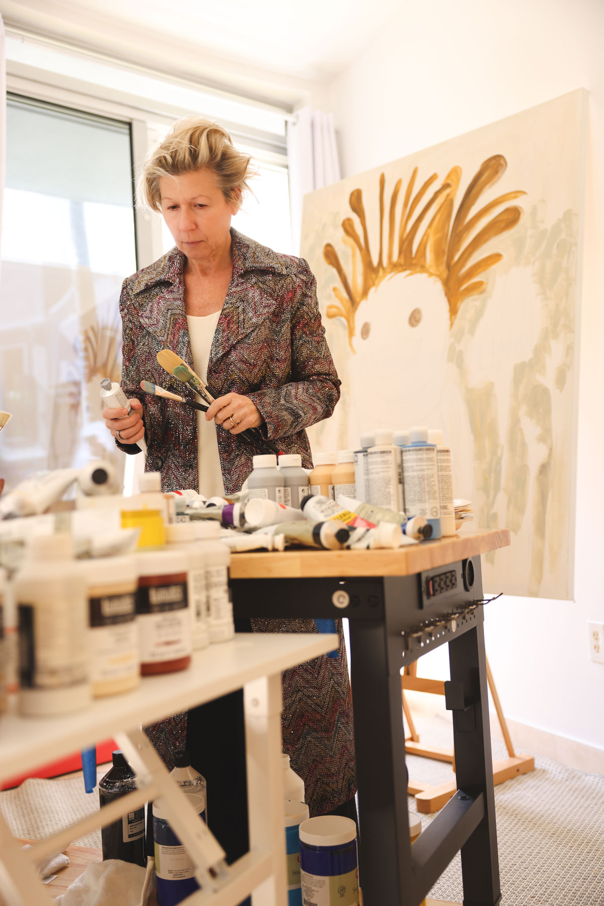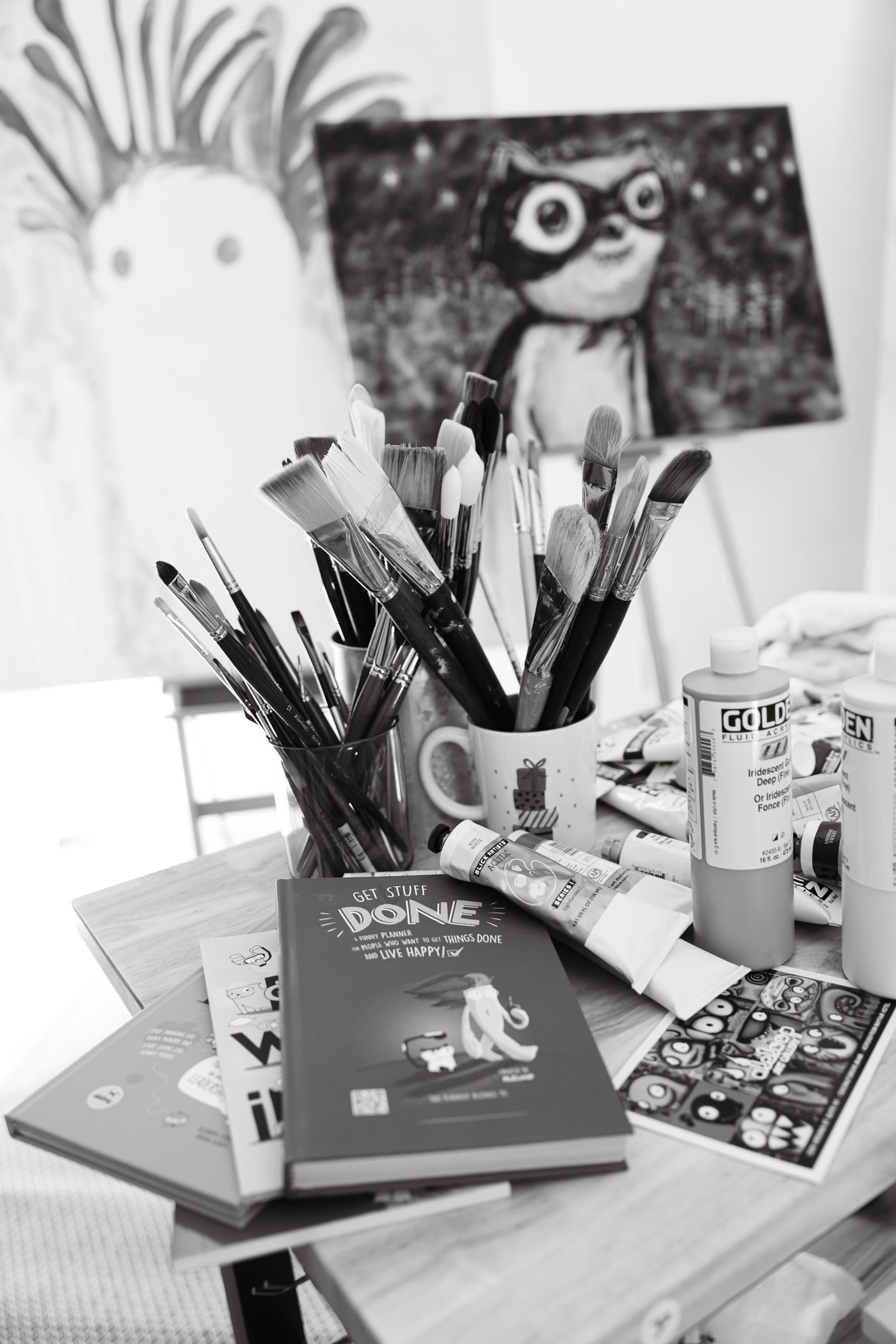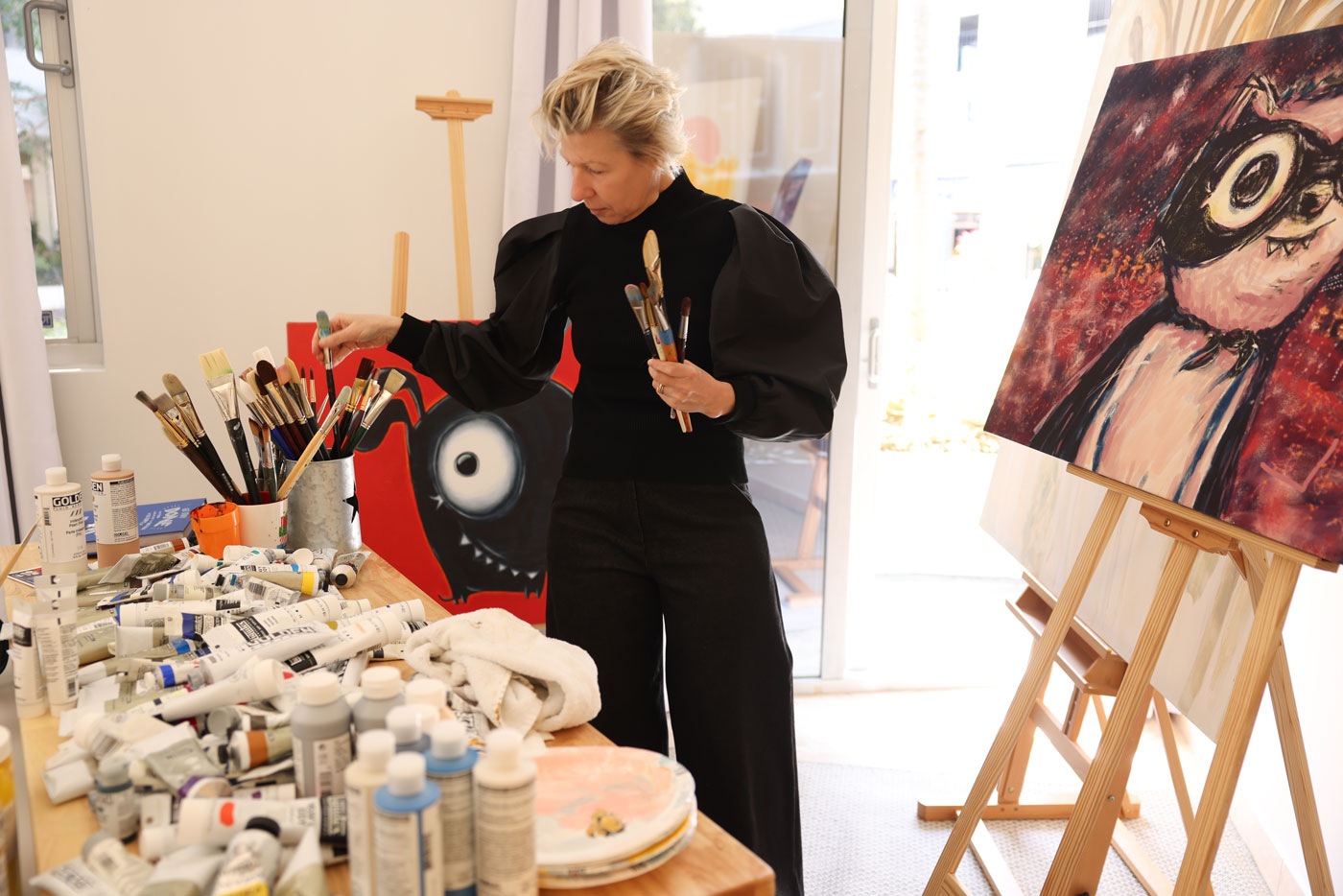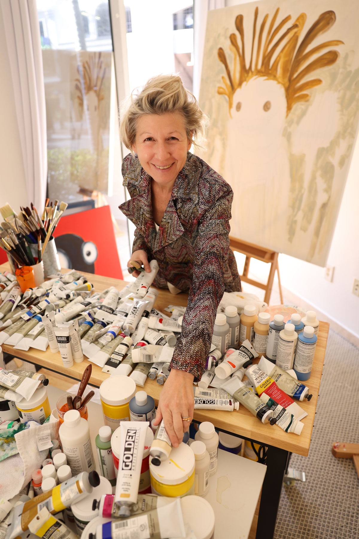 Though long known as a digital artist, Leibovich transitioned, almost in reverse, into painting following a period of serious illness that forced her to slow down and return to drawing by hand. Beginning with small, quirky figures, her practice gradually shifted toward acrylics, pencil, and paint, emphasizing tactility, natural light, and the physical act of mark-making. These cartoon-like figures function as emotional proxies rather than literal narratives, balancing levity and vulnerability while reflecting deeply personal experiences.